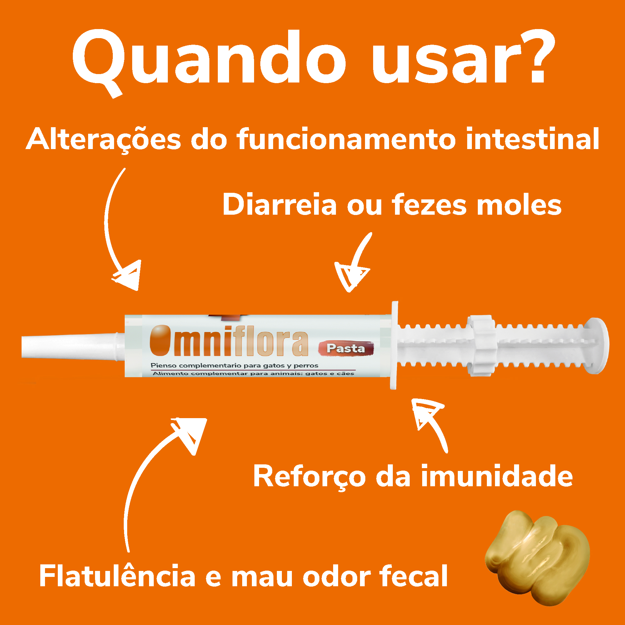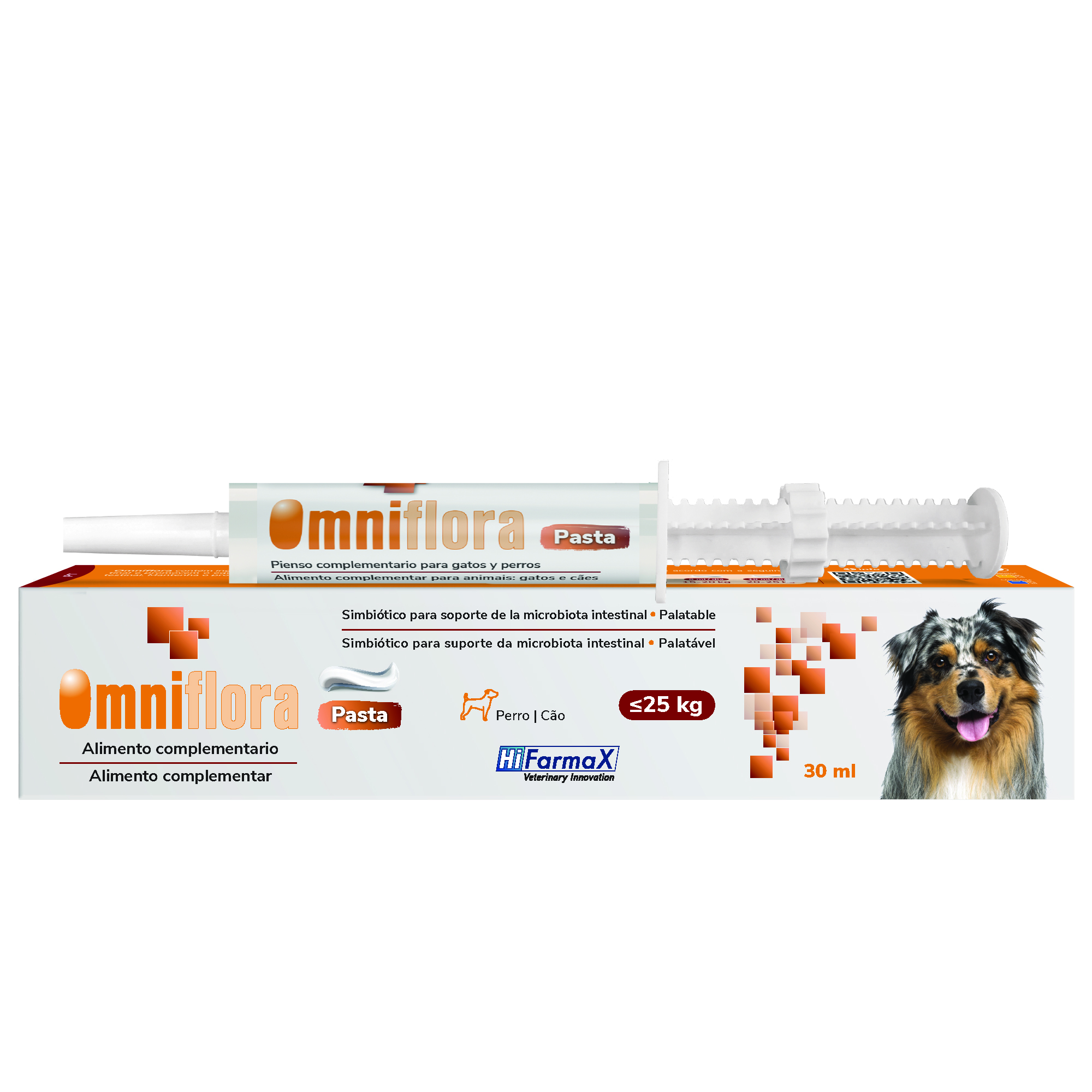 Omniflora pasta palatável é o simbiótico intestinal concebido para a abordagem inicial à diarreia que proporciona o mais rápido reequilíbrio da função intestinal e da descompensação sistémica.