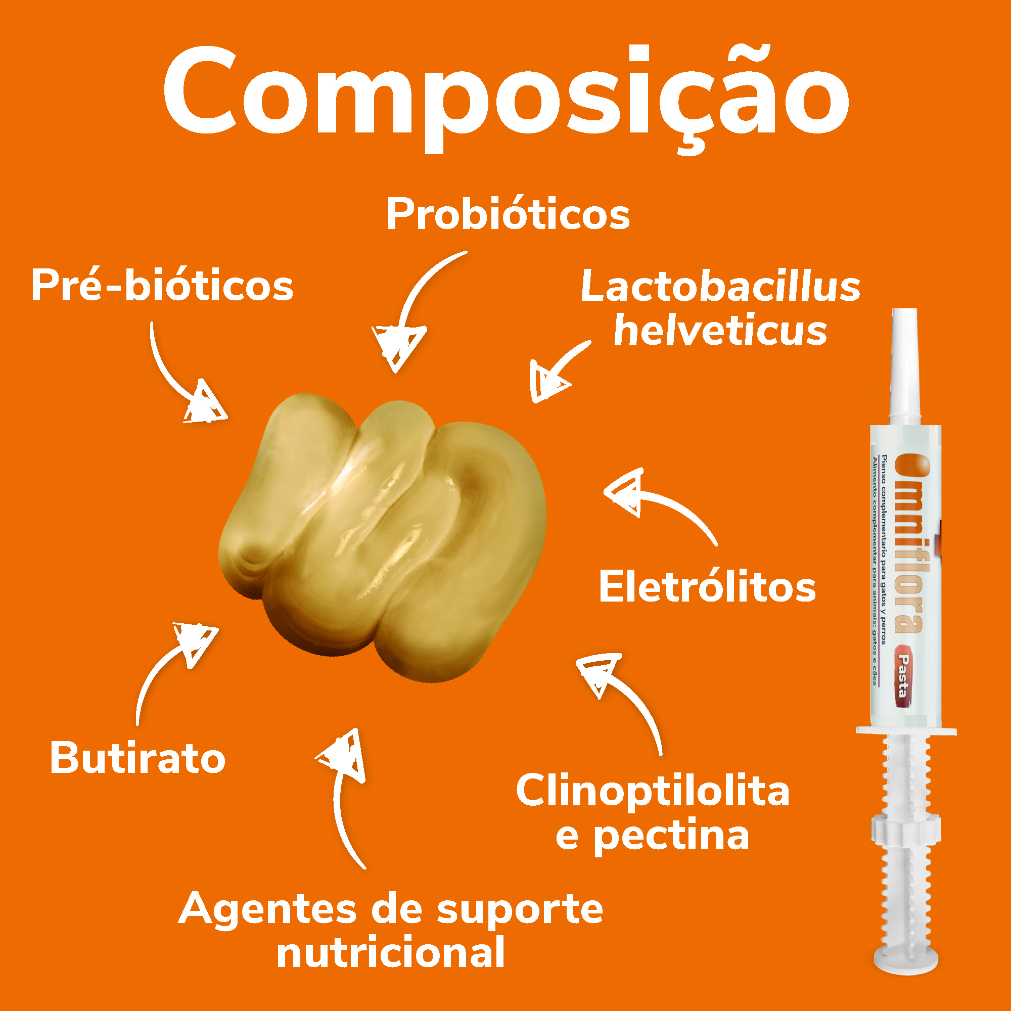 Omniflora pasta contém 7 grupos funcionais de ingredientes: probióticos, prebióticos, adsorventes, parabióticos, pós-bióticos, eletrólitos e nutrientes de suporte das células intestinais.